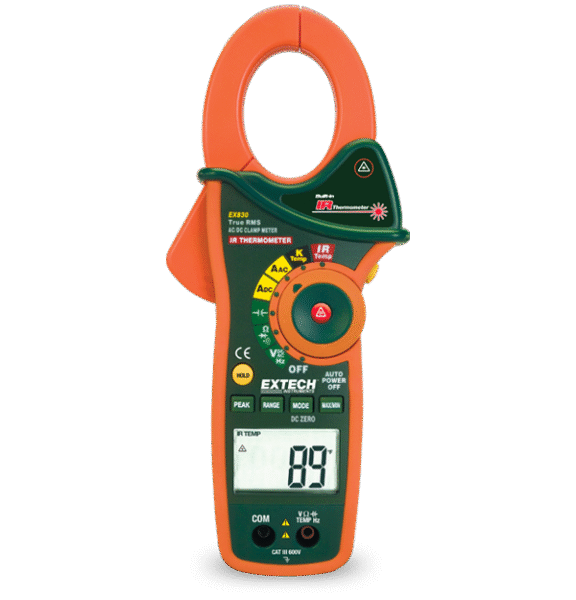 - EXTECH EX830 (Heavy Duty): Una pinza True RMS AC/DC de 1000A que destaca por incluir un termómetro IR (sin contacto). Ideal para técnicos de HVAC y mantenimiento industrial que necesitan medir la temperatura de motores y conductos rápidamente.