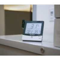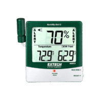 El Extech 44585 es un higrotermómetro con alerta de humedad y punto de rocío. Este medidor de humedad cuenta con una gran pantalla triple que muestra la humedad relativa, la temperatura y el punto de rocío.