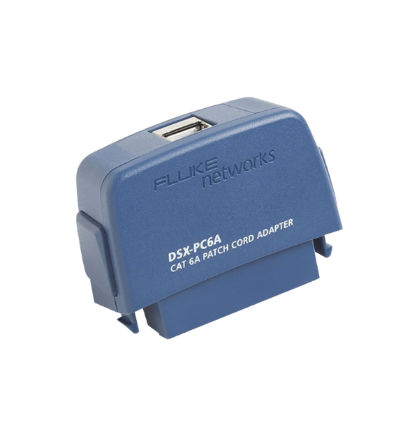 El adaptador Fluke DSX-PC6A es un accesorio diseñado para los probadores de cableado de la serie Fluke Networks DSX CableAnalyzer. Este adaptador es un componente clave para realizar mediciones precisas y fiables de cables de conexión (patch cords) de Categoría 6A, lo que permite a los técnicos verificar el rendimiento de estos cables conforme a las especificaciones ISO/IEC 11801 y TIA 568. Su diseño específico garantiza que el punto de medición se encuentre lo más cerca posible del conector, minimizando las reflexiones y asegurando la precisión de los resultados.