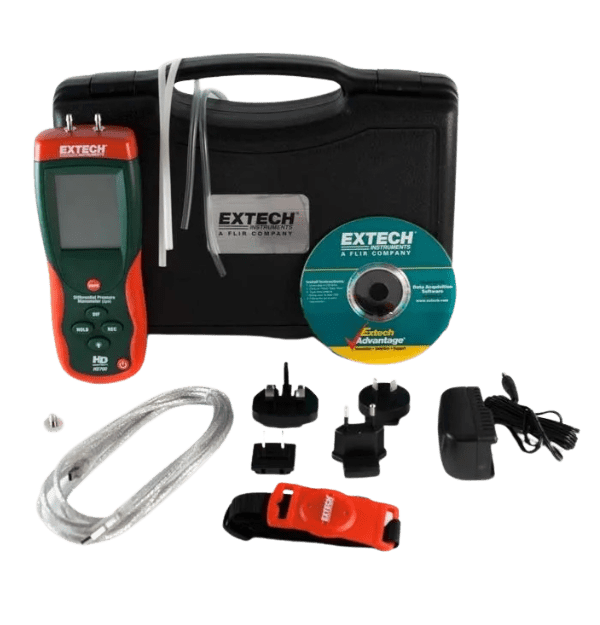 El manómetro de presión diferencial HD750 de Extech es una herramienta versátil y precisa para medir la presión diferencial en una amplia gama de aplicaciones. Con un rango de medición de ±5 psi y 11 unidades de medida seleccionables, este manómetro es ideal para una variedad de tareas, incluyendo la comprobación de filtros, la medición de la presión del aire en conductos y la evaluación del rendimiento de las bombas.