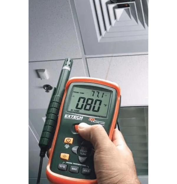 El termohigrómetro RH101 de Extech es un instrumento versátil que combina un higrómetro y un termómetro infrarrojo en un solo dispositivo compacto. Es ideal para medir la humedad relativa y la temperatura ambiente en una variedad de aplicaciones, incluyendo: