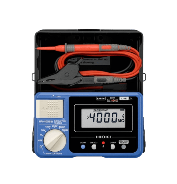 El IR4056-20 destaca por su diseño “todo en uno”, con una carcasa rígida integrada que protege el equipo y organiza las puntas de prueba. Su función de comparación con alertas visuales (LED rojo/verde) y auditivas permite realizar inspecciones masivas de forma rápida y sin margen de error. Es capaz de medir aislamiento hasta 1000V y cuenta con una función de medición de voltaje CA/CC automática de alta precisión.