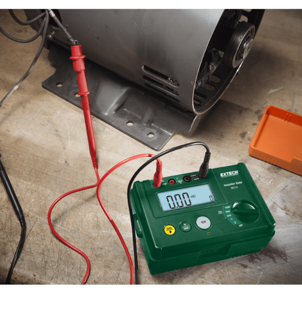 El Extech MG310 es un medidor de aislamiento y continuidad digital portátil y robusto, diseñado para electricistas, técnicos de mantenimiento y profesionales que requieren verificar la resistencia de aislamiento en cables, motores, transformadores y otros equipos eléctricos, así como realizar pruebas de continuidad en circuitos. Este instrumento ofrece múltiples voltajes de prueba de aislamiento y rangos de resistencia para adaptarse a diversas aplicaciones.