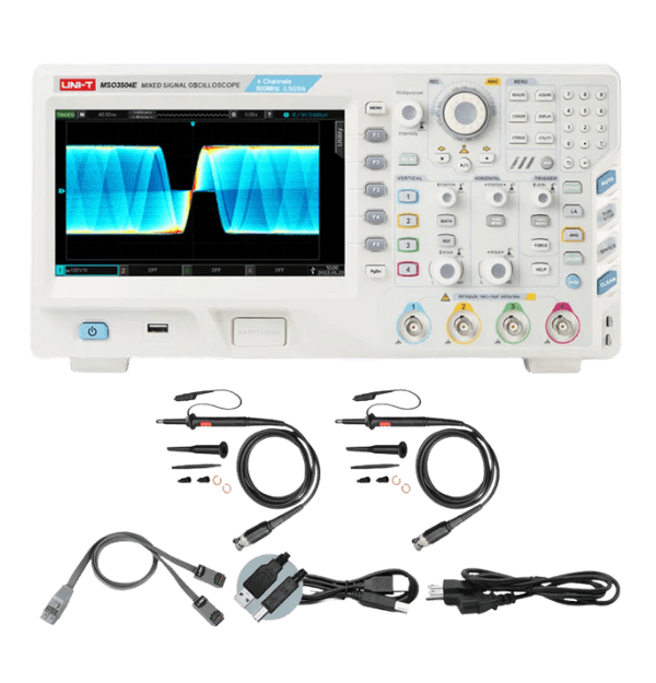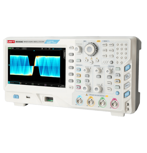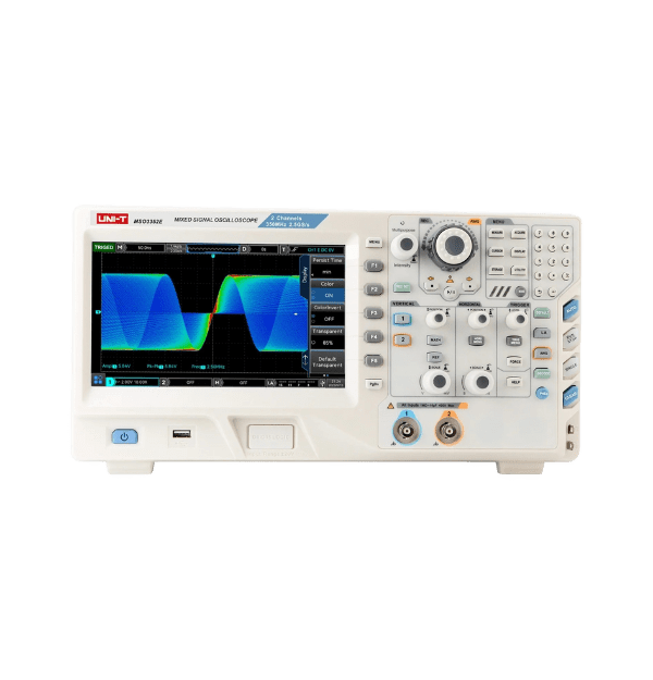 El UNI-T MSO3352E es un Osciloscopio de Señal Mixta (MSO) de la serie MSO3000E, diseñado para el análisis riguroso de electrónica de alta velocidad y sistemas embebidos complejos. Con un amplio ancho de banda de y una formidable tasa de muestreo de , este instrumento permite capturar con precisión transitorios rápidos y analizar la integridad de la señal. Su configuración de 2 canales analógicos y 16 canales digitales (MSO) lo convierte en una herramienta integral para correlacionar el dominio analógico y el digital. Además, incorpora la tecnología Ultra Phosphor 2.0 en su pantalla táctil capacitiva de 8 pulgadas para un despliegue de forma de onda claro y con profundidad de color.