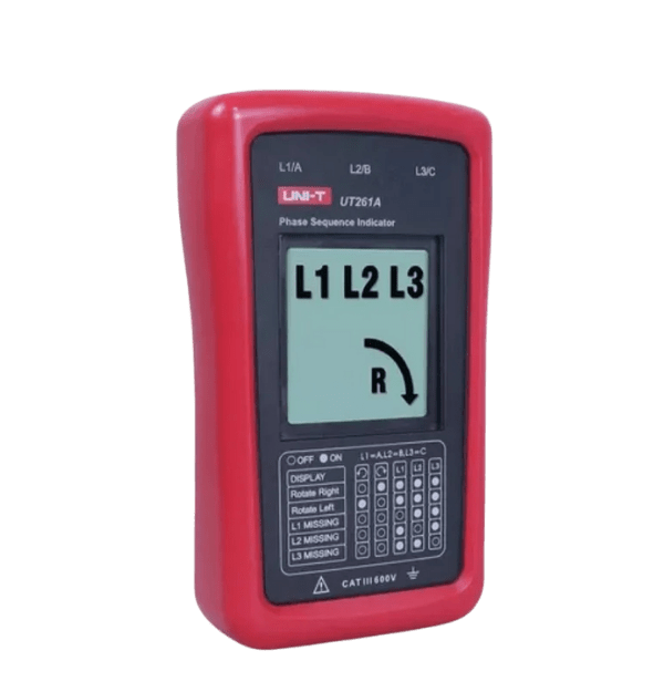 El secuencimetro UNI-T UT261A es un instrumento compacto y robusto diseñado para determinar la secuencia de fase de alimentación trifásica, la indicación de fase faltante y la rotación de fase del motor. Con su rango de medición de voltaje de 40V a 690V y frecuencia de 15Hz a 400Hz, el UT261A es ideal para una amplia gama de aplicaciones en entornos industriales y comerciales.