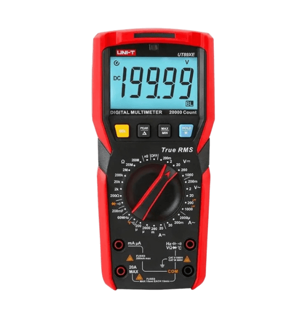El UNI-T UT89XE es un multímetro digital de grado profesional que destaca por su alta resolución de 20,000 cuentas y su capacidad de medición de Valor Eficaz Verdadero (True RMS). Este equipo está diseñado para técnicos e ingenieros que requieren una precisión superior y funciones avanzadas para diagnosticar sistemas eléctricos, electrónicos y de automatización, incluyendo aquellos con señales de frecuencia variable (VFD) y ruido.